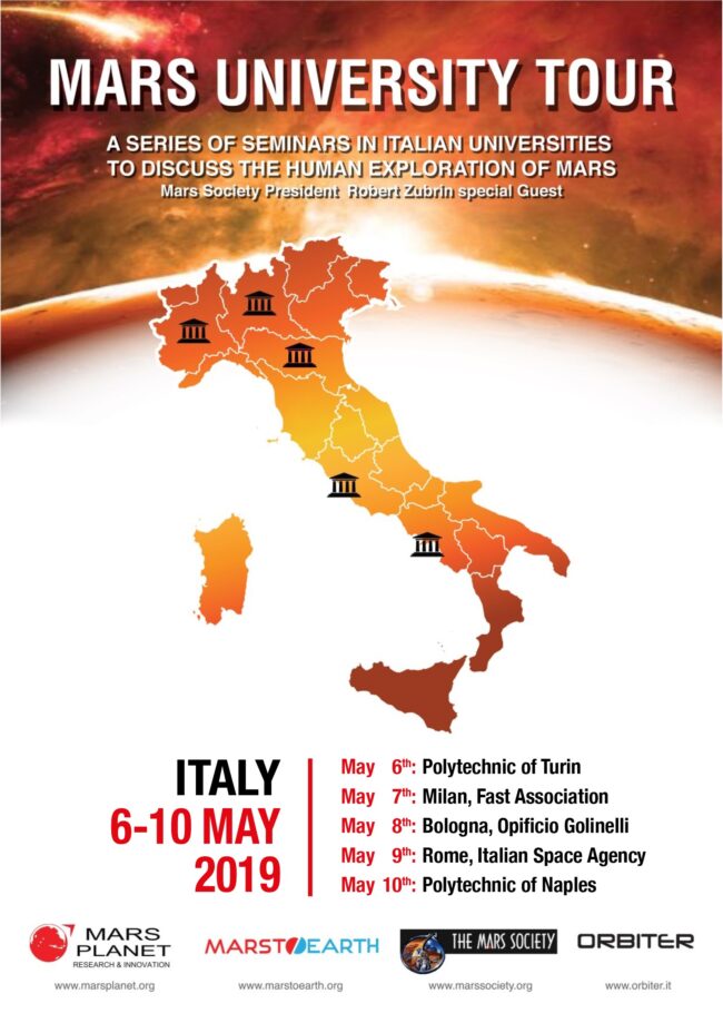 Five destinations of prestige for our Mars University Tour: 6th May: Polytechnic of Turin 7h May: Milan, Fast Association: www.fast.mi.it 8th May: Bologna, Opificio Golinelli: https://www.fondazionegolinelli.it 9th May: Rome, Italian Space Agency: www.asi.it 10th May: Naples, Polytechnic of Naples. Robert Zubrin keynote Speaker For info : mte@marsplanet.org