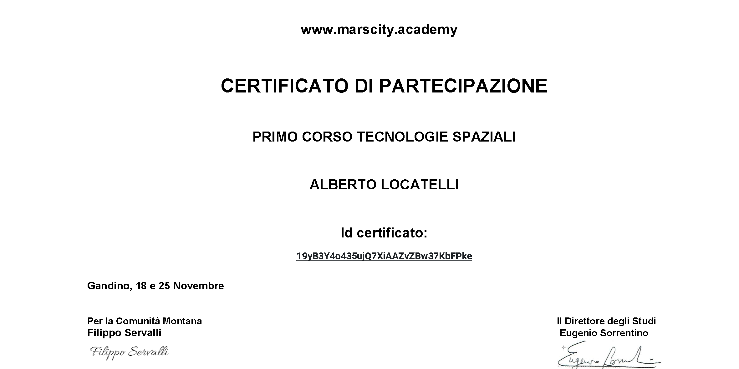 The Certificate of partecipation to the first marscity.academy course on Space Technologies of Seriana Space Valley has been delivered.