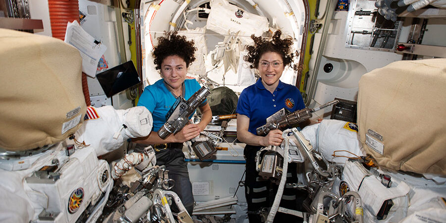 Astronauts Christina Koch and Jessica Meir carried out history’s first all-female spacewalk Friday, floating outside the International Space Station and successfully installing a 230-pound replacement battery charger in the lab’s solar power system.